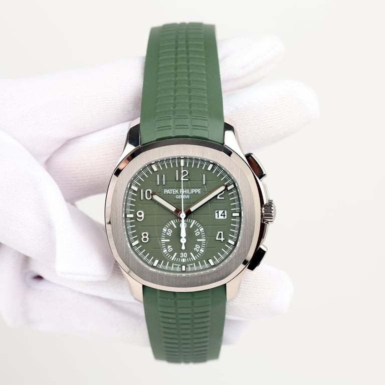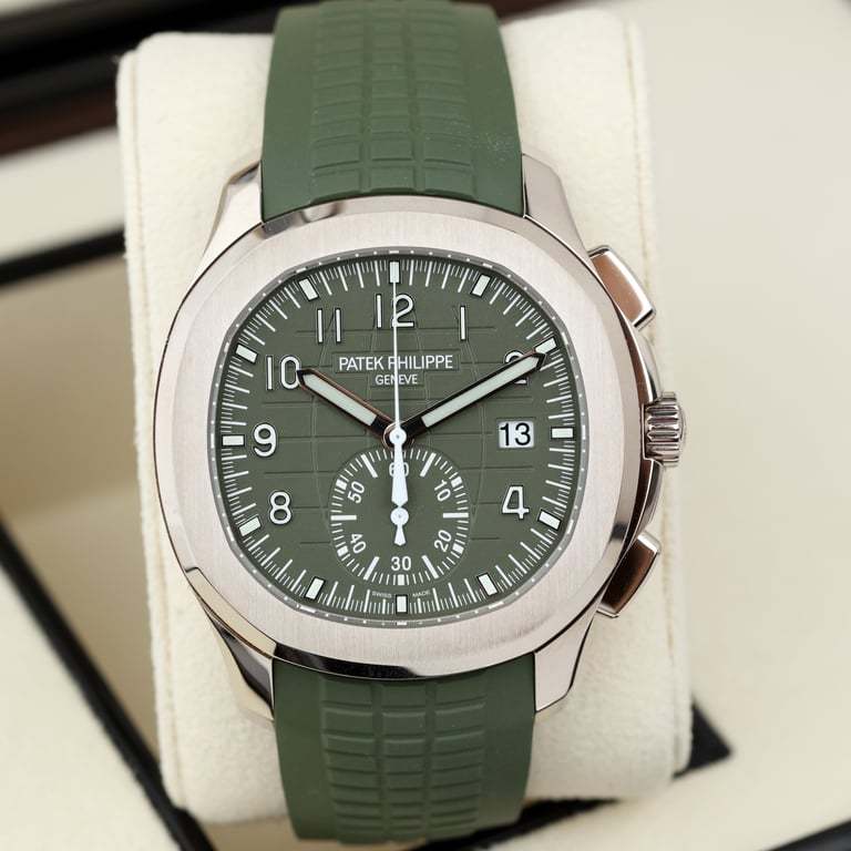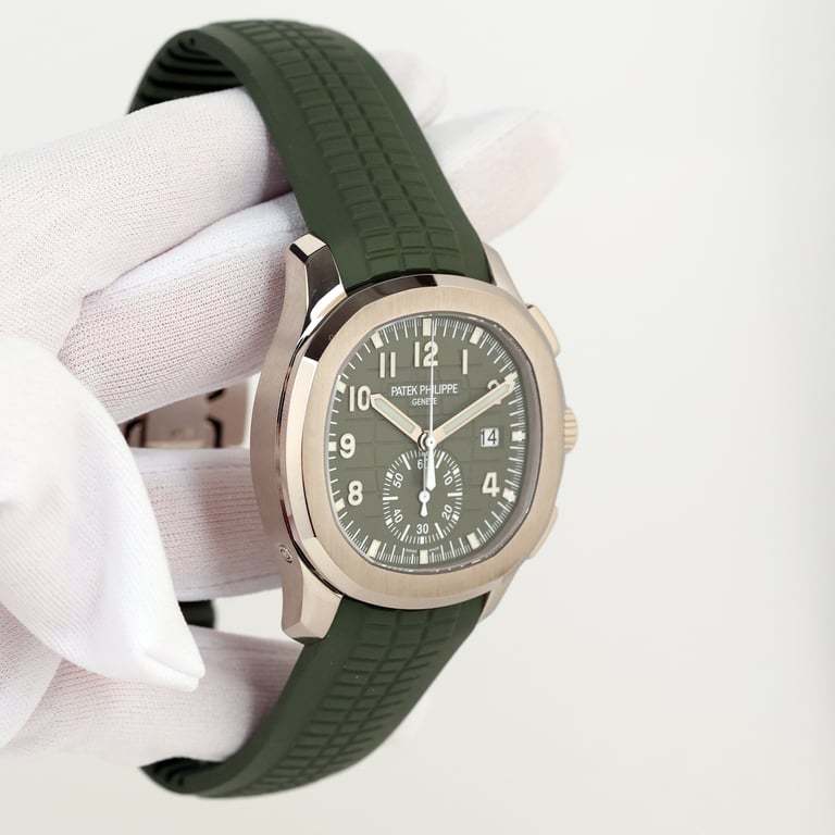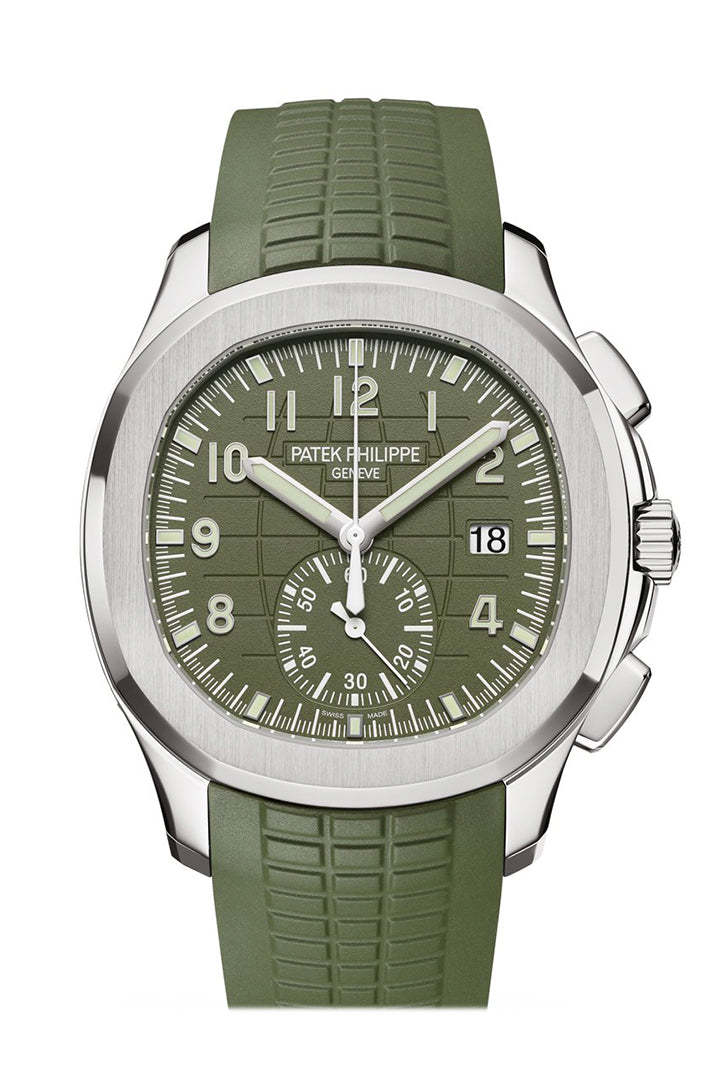 Patek Philippe Aquanaut Mens Watch 5968G-010 Patek Philippe is reasserting the "contemporary casual chic" spirit of the Aquanaut flyback chronograph with the first white gold version of this self-winding model, combined with a bold khaki-green color for the dial and matching composite strap. Water-resistant to 120 m, the case is enhanced by polished and satin finishes. The 60-minute counter at 6 o'clock picks up the rounded octagonal shape of the bezel. The patented fold-over clasp is secured by four independent catches.Self-winding mechanical movement. Caliber CH 28‑520 C. Flyback chronograph. Central chronograph hand. 60-minute counter. Date in an aperture. Khaki green, embossed with Aquanaut pattern, gold applied numerals with luminescent coating. White gold. Screw-down crown. Sapphire-crystal case back. Water-resistant to 120m. Diameter (10-4 o’clock): 42.2 mm. Height: 11.9 mm. Composite material, khaki green. Aquanaut fold-over clasp. 2021 new release Model