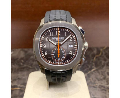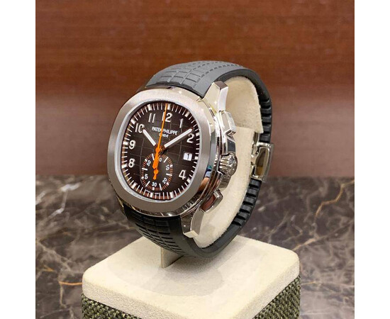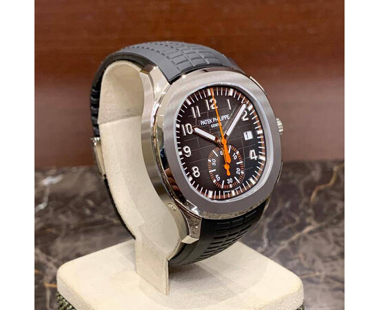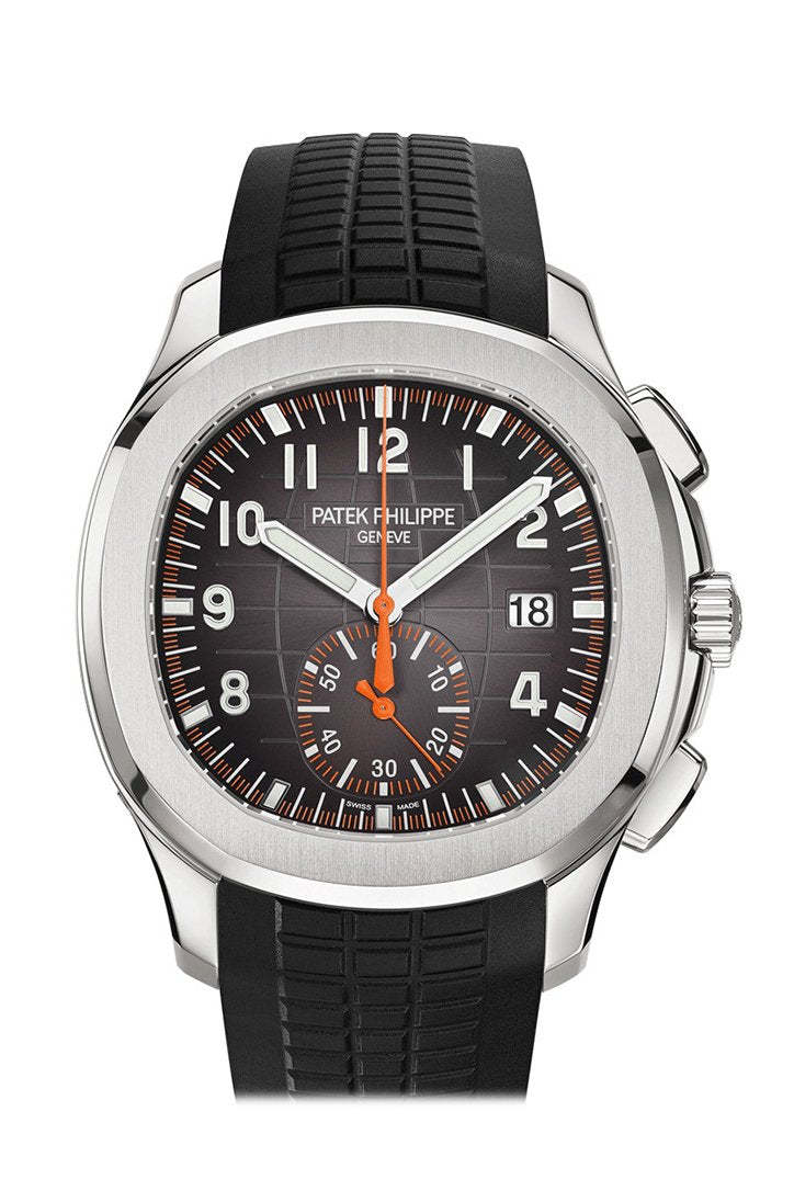 Silver-tone stainless steel case with a black rubber strap. Fixed bezel. Black dial with silver-tone hands and Arabic numeral hour markers. Dial Type: Analog. Date display at the 3 o'clock position. One- 60 minutes subdials. Patek Phillipe Calibre CH 28-520 C automatic movement with a 55-hour power reserve. Scratch resistant sapphire crystal. Screw down crown. Transparent case back. Cushion case shape, case size: 42.2 mm, case thickness: 11.9 mm. Band width: 22 mm. Fold-over clasp. Water resistant at 120 meters / 400 feet. Functions: date, hour, minute, second. Additional Info: comes with interchangeable orange composite strap. Luxury watch style. Watch label: Swiss Made. Patek Philippe Aquanaut Black Dial Automatic Mens Chronograph Watch 5968A-001.