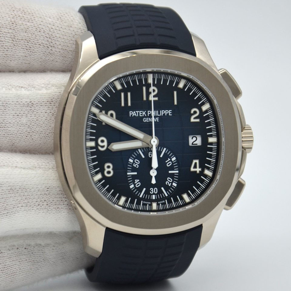 Patek Philippe is reasserting the "contemporary casual chic" spirit of the Aquanaut flyback chronograph with the first white gold version of this self-winding model, combined with an elegant midnight blue color for the dial and matching composite strap.