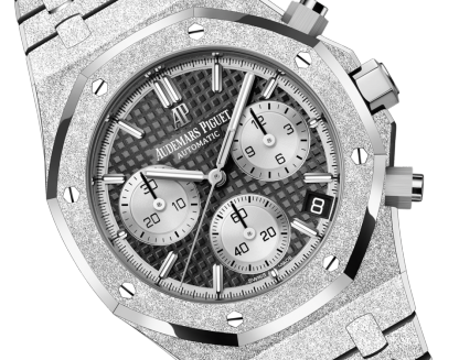 Black dial with ??Grande Tapisserie?? pattern, rhodium-toned counters, white gold applied hour-markers and Royal Oak hands with luminescent coating.