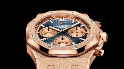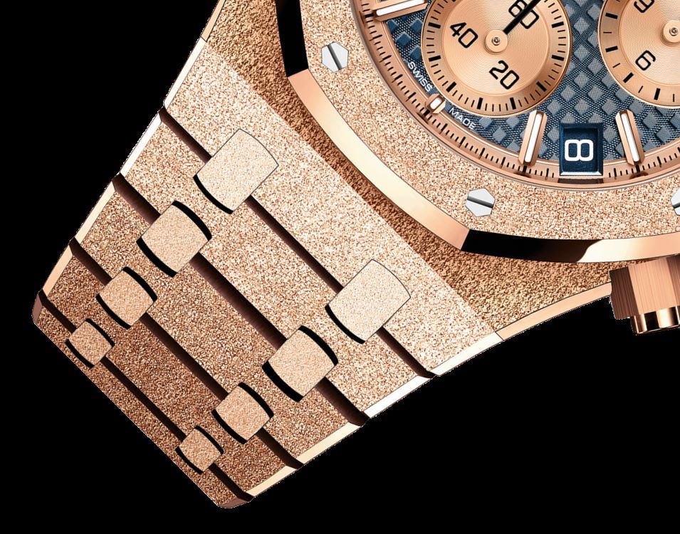 Blue dial with ??Grande Tapisserie?? pattern, pink gold-toned counters, pink gold applied hour-markers and Royal Oak hands with luminescent coating.
