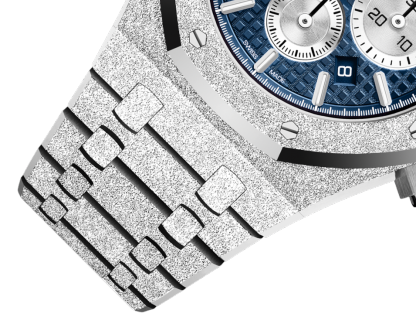 Blue dial with ??Grande Tapisserie?? pattern, rhodium-toned counters, white gold applied hour-markers and Royal Oak hands with luminescent coating.