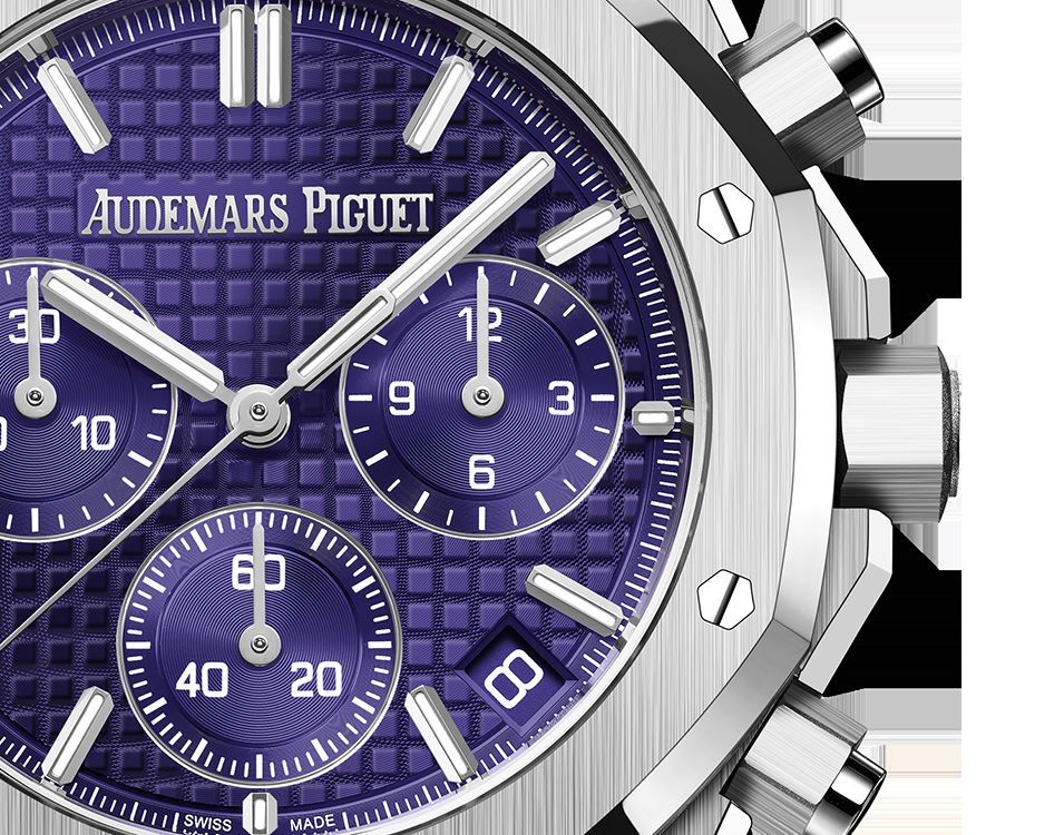 Purple dial with ??Grande Tapisserie?? pattern, purple counters, white gold applied hour-markers and Royal Oak hands with luminescent coating.