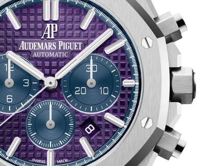 Plum purple dial with ??Grande Tapisserie?? pattern, blue counters, blue external zone, white gold applied hour-markers and Royal Oak hands with luminescent coating.