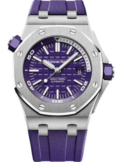 Purple dial with ??M??ga Tapisserie?? pattern, white gold applied hour-markers and Royal Oak hands with luminescent coating, purple rotating inner bezel with zone from 60 to 15 minutes in white.