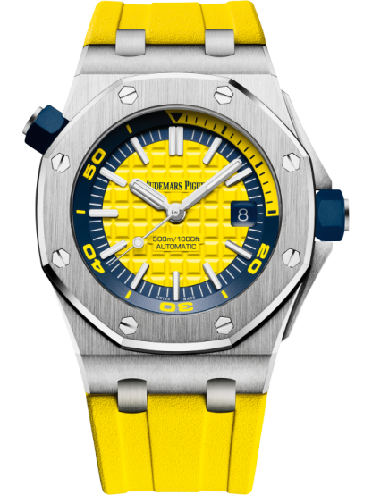 Yellow dial with ??M??ga Tapisserie?? pattern, white gold applied hour-markers and Royal Oak hands with luminescent coating, blue rotating inner bezel with diving scale and zone from 60 to 15 minutes in yellow.