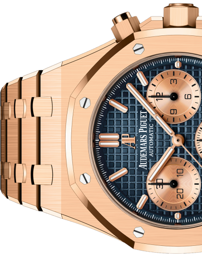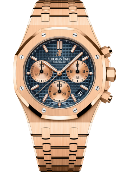Blue dial with ??Grande Tapisserie?? pattern, pink gold-toned counters, pink gold applied hour-markers and Royal?Oak hands with luminescent coating